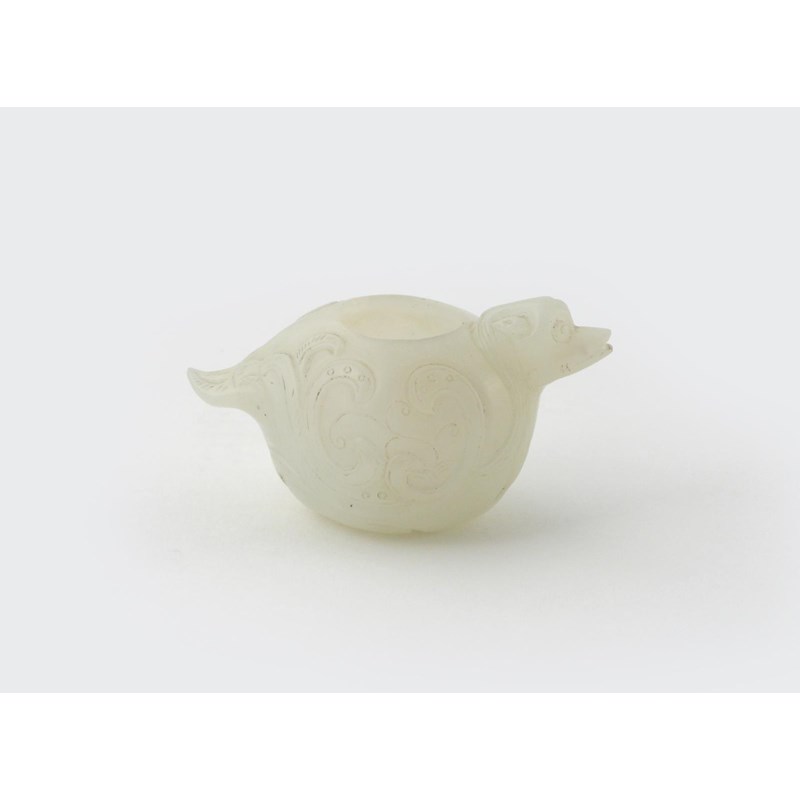 A Chinese white jade water dropper probably 19th century, with a round body carved with stylized feathers, and a short stubby tail, 7cm.