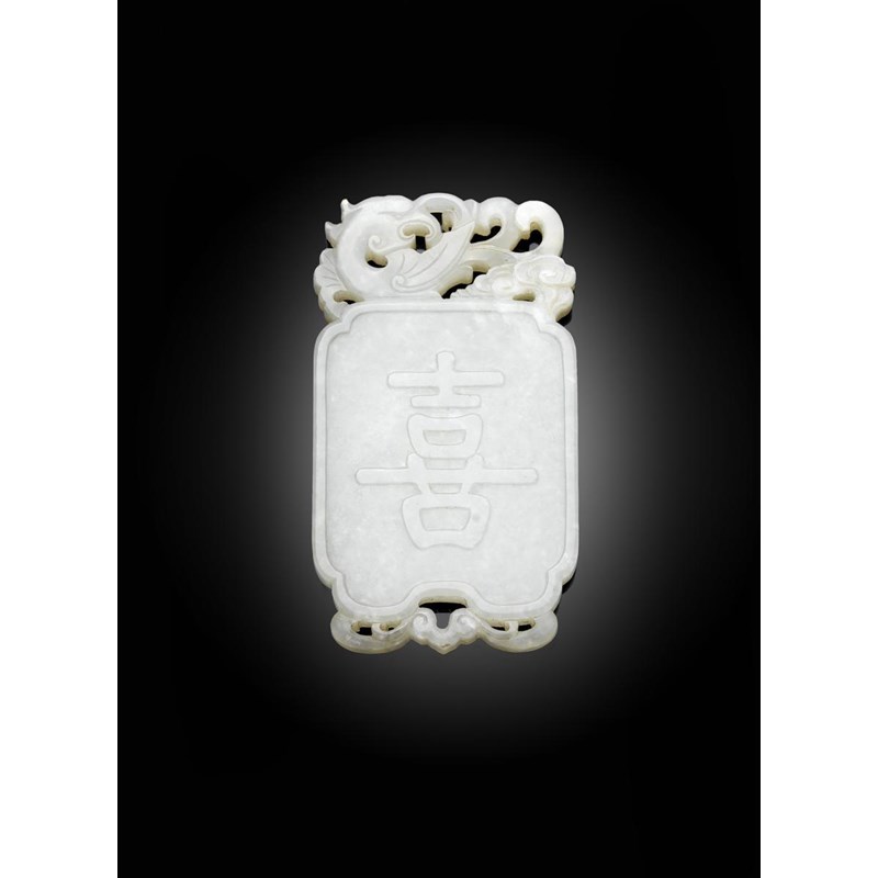 A Chinese white jade plaque 18th / 19th century, one side carved with a boy and a bat, the reverse with a single xi (joy) character, and with a phoenix surmount, 6.5cm.