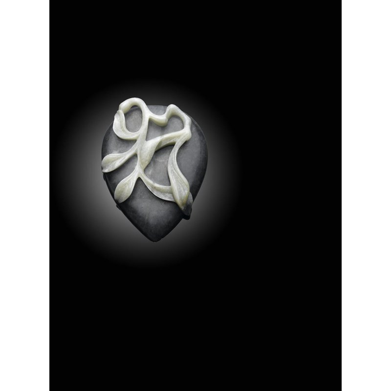 An unusual Chinese jade tear-shaped dish probably 19th century, the shallow dish surface edged with a key fret in a mottled grey-black jade and supported on a base of slender foliage in celadon jade, 7.6cm.