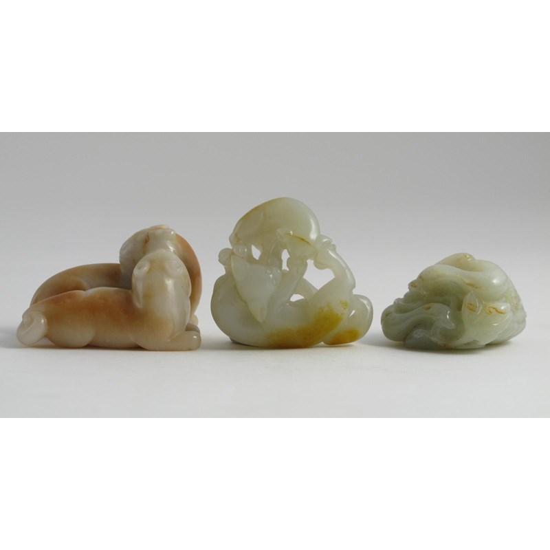 Three Chinese jade animal carvings 19th / 20th century, one of two geese on a lotus leaf, another of two cats, the third of two squirrels, 6.5cm. (3)