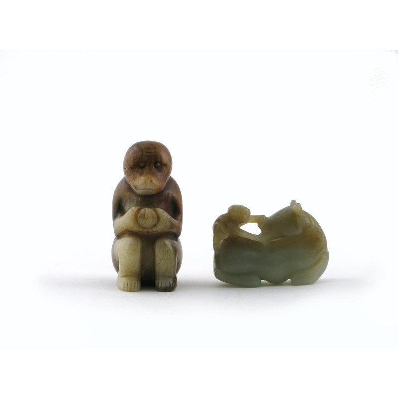 Two Chinese jade carvings 19th century, one of a monkey clutching a peach the other of a horse and a monkey, 6cm. (2)