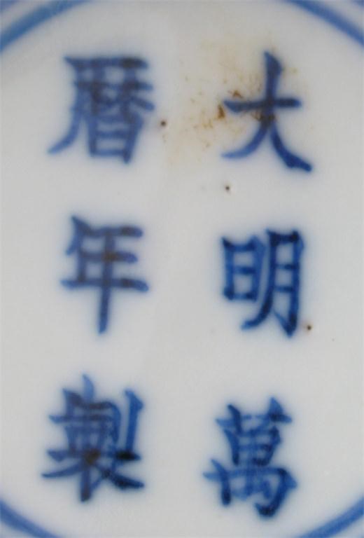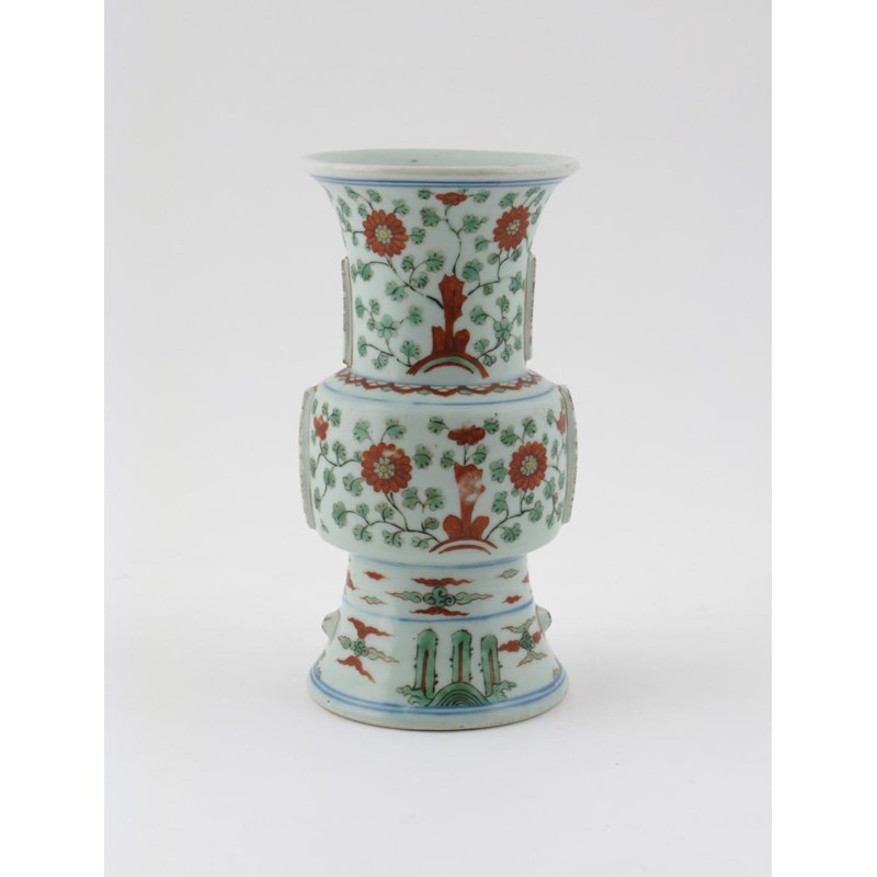 A Chinese wucai vase of archaic form six character Wanli mark and of the period 1573-1620, painted in red, green and black with a stylized design of flowers growing from rockwork, 23cm.