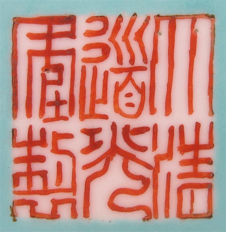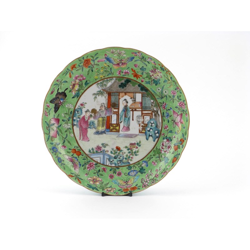 A Chinese famille rose dish six character Daoguang seal mark and of the period 1821-50, decorated with figures in a garden within a border of butterflies, peaches and flowers on a green ground, a rim crack, 23.8cm.