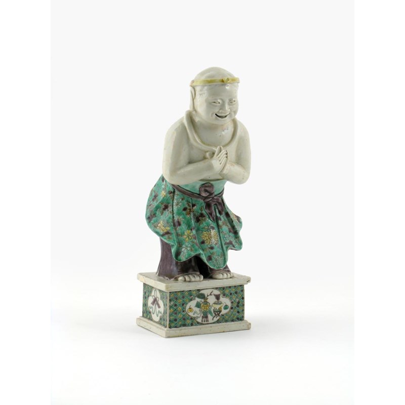 A Chinese famille verte model of a boy c.1850, kowtowing a greeting and wearing a green floral robe, raised on a rectangular plinth, 27cm.