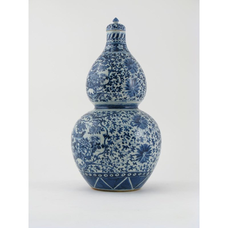 A Chinese blue and white gourd shaped vase and cover 19th century, decorated with elaborate panels amidst foliage on a complex lotus scroll ground, damage to the neck, 47cm. (2)