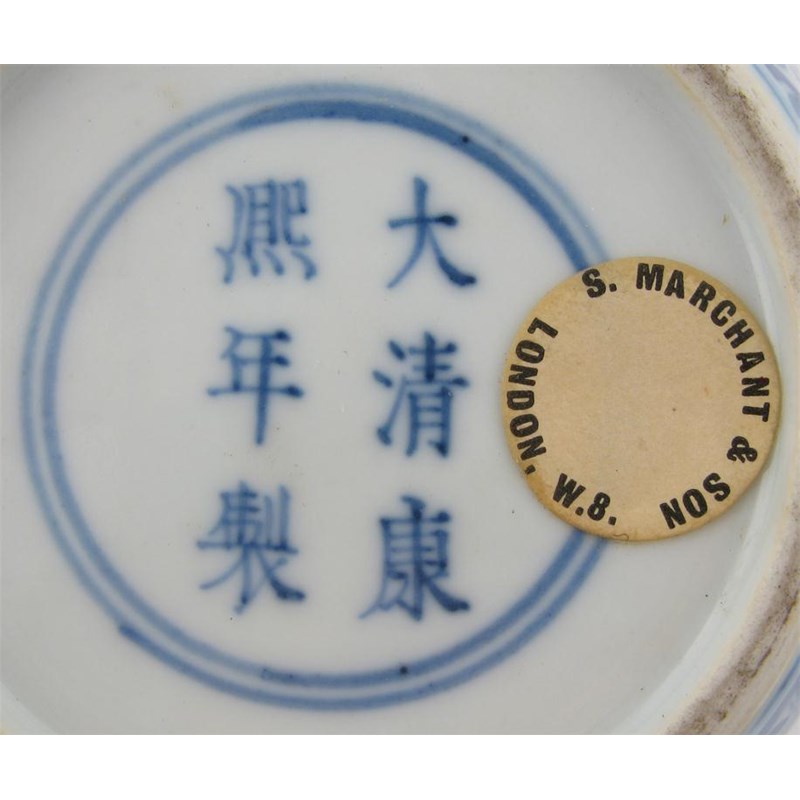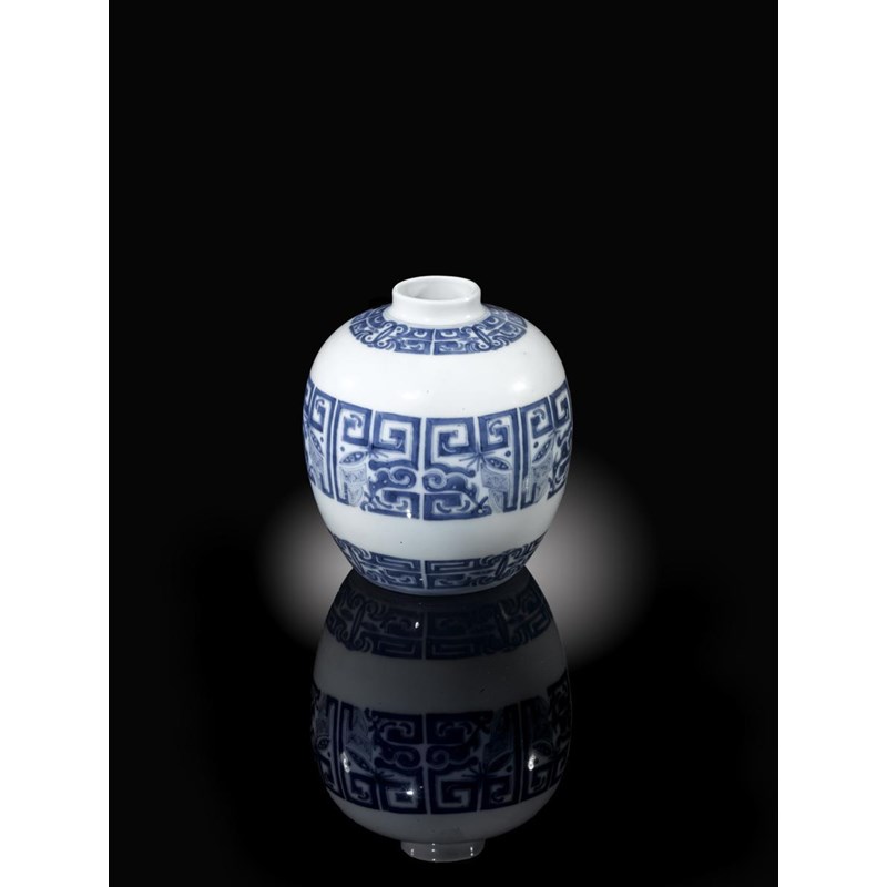 A rare Chinese blue and white ovoid vase six character Kangxi mark and of the period 1662-1722, decorated with a wide band of stylized taotie and with smaller bands to the shoulder and foot, 13.2cm.