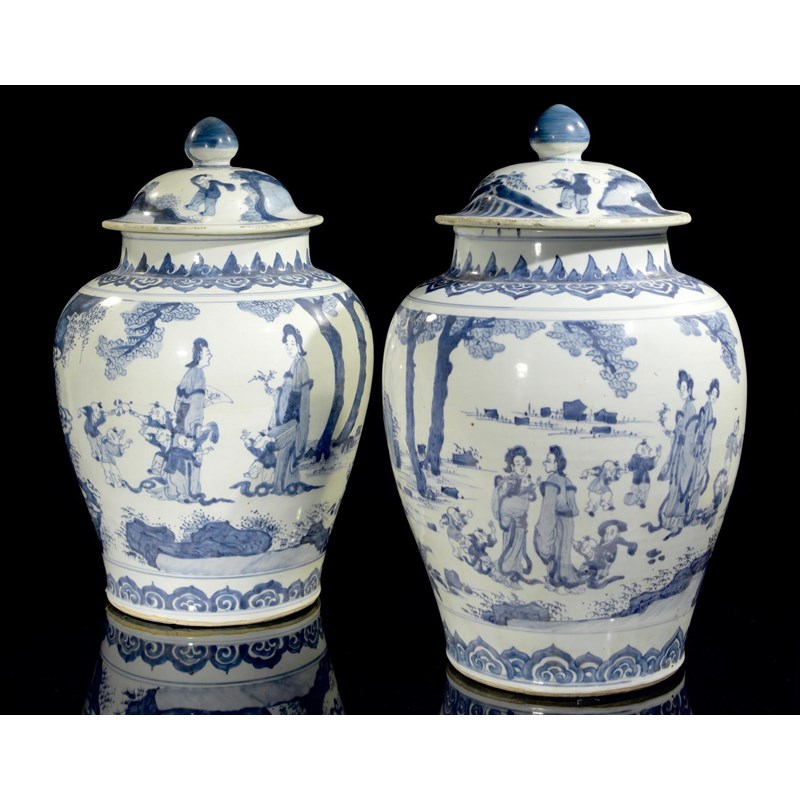 A large and fine pair of Chinese blue and white baluster vases and covers 17th century, each painted with young ladies attending a multitude of children at play beneath trees and with stylized clouds and rocks to the reverse, the shoulders and feet with borders of ruyi heads, some fritting to the rims, 50cm. (4)