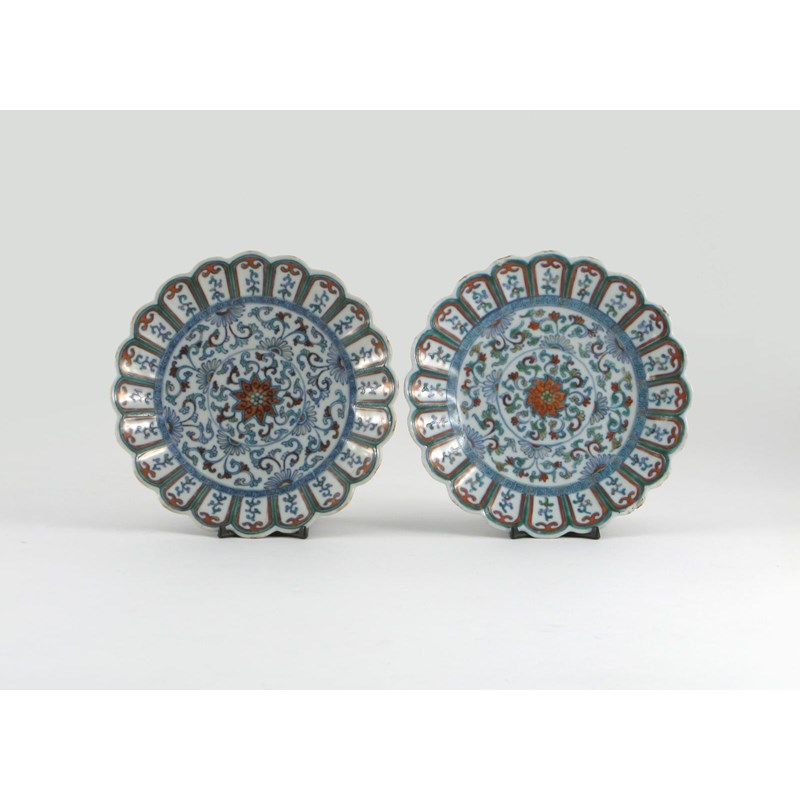 A pair of Chinese doucai petal-shaped dishes six character Qianlong seal marks, c.1790, each painted with flowers, foliage and stylized scrolls, chips to the feet and rims, 16cm. (2)