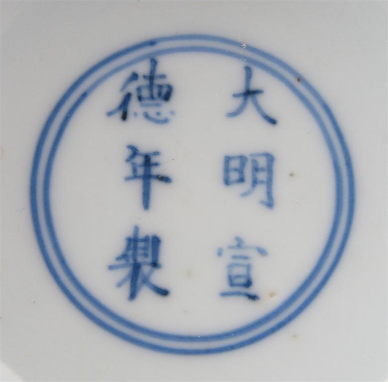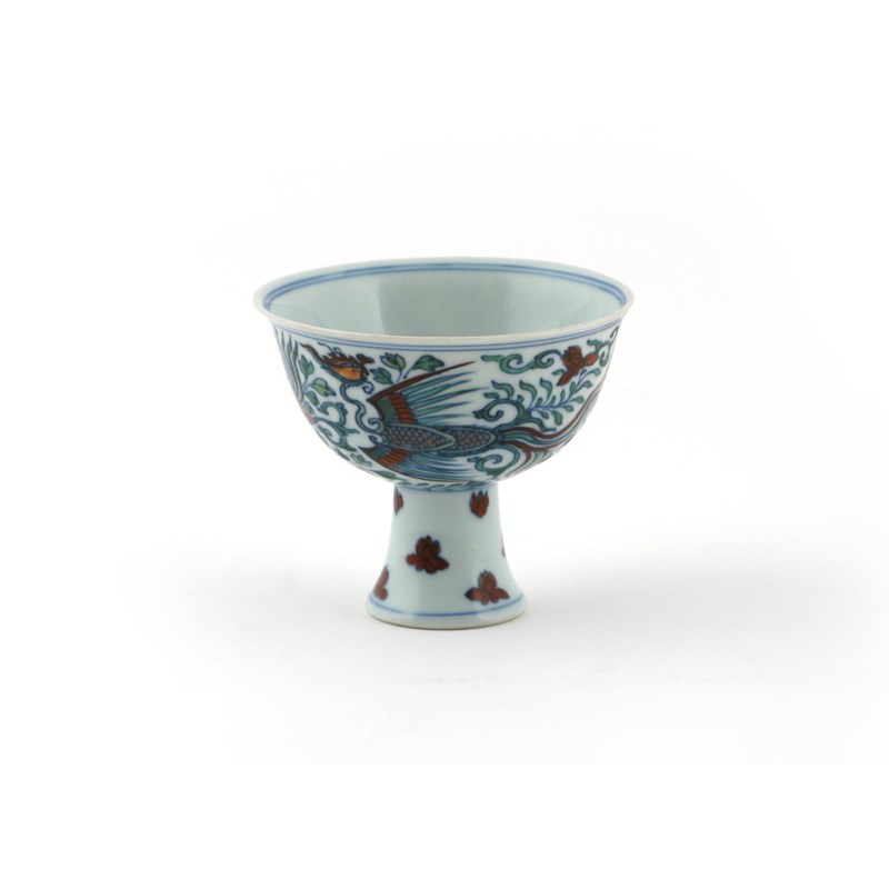 A Chinese doucai stem bowl six character Xuande mark but 18th century, the exterior decorated with two phoenix flying amidst flowers and foliage, raised on a flared foot with iron red lotus flowers, minor rim faults, 9.5cm.