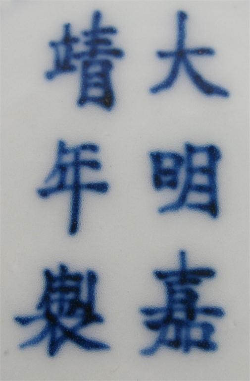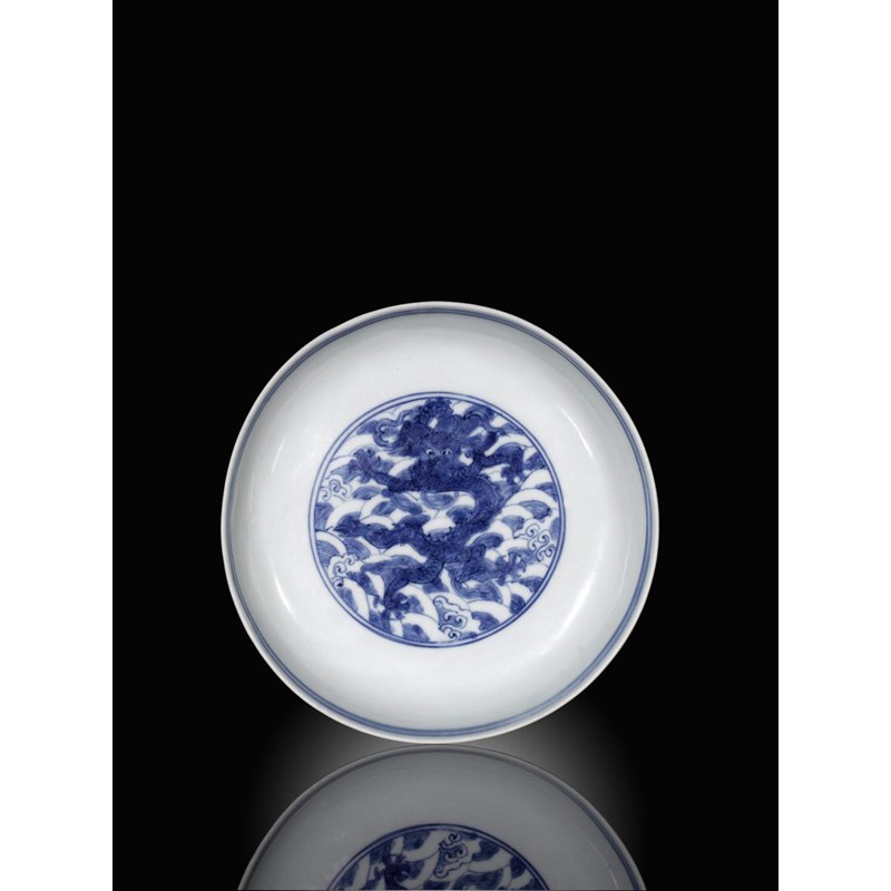 A Chinese blue and white dragon saucer dish Jiajing six character mark and of the period, 1522-1566, painted with a large circular medallion containing a confronting five-clawed dragon amidst waves, the reverse with two further dragons, all within double-line borders, a faint 1cm rim crack, 19.6cm.