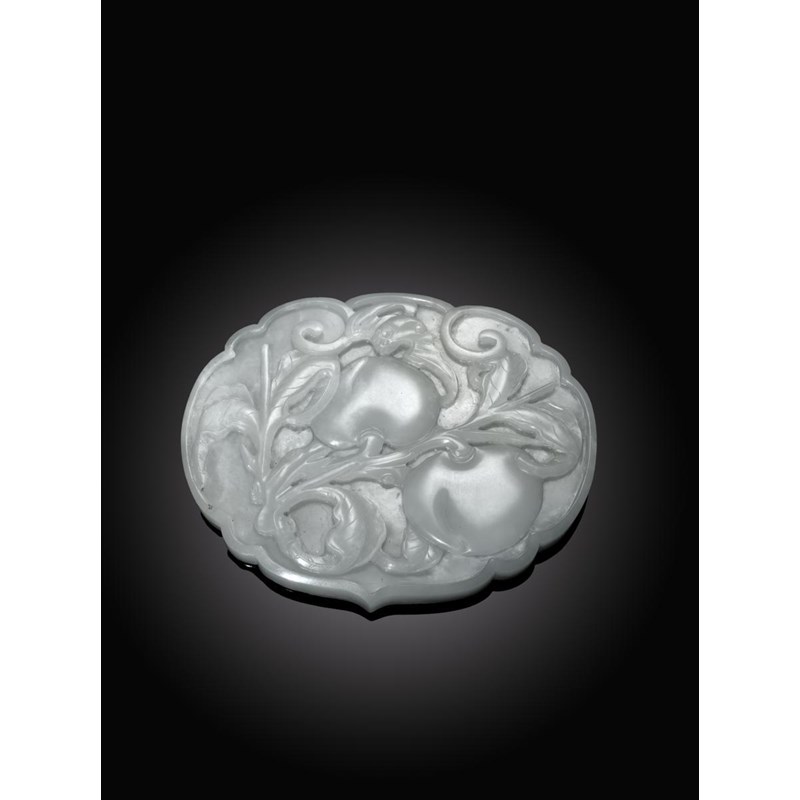 A Chinese white jade ruyi-shaped plaque 18th/19th century, carved in relief with a bat amongst two peaches and leafy stalks, 13.2cm.