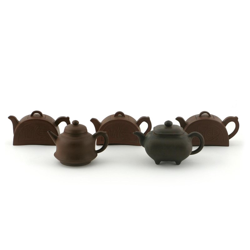 Five Yixing teapots and covers 19th century, three of semi-circular design decorated with stylized characters, and two others, seal marks, 18cm. (10)