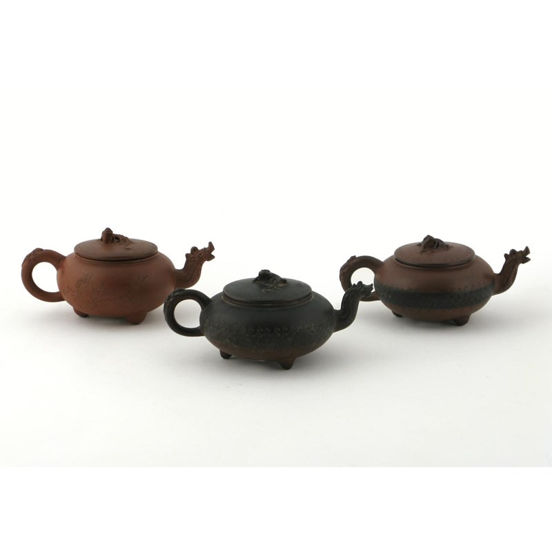 Three Yixing teapots and covers 19th century, the compressed globular bodies modelled with dragon head spouts, the cover finials as curled chilong dragons, one incised with flowers and calligraphy, two partially enamelled black with diaper and ruyi bands, all raised on three stump feet, seal marks, small faults and repairs, 19.7cm. (6)