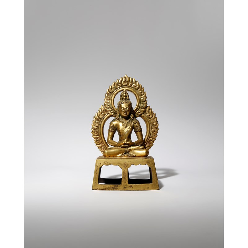 Depicted seated in dhyanasana upon a rectangular pedestal which flares towards the base, with his hands held upon his lap in dhyana mudra, he wears body jewellery and simple robes, his hair adorned with beads and with traces of cold painting, all framed by a flaming mandorla set behind him, 20.1cm, 1.9kg.