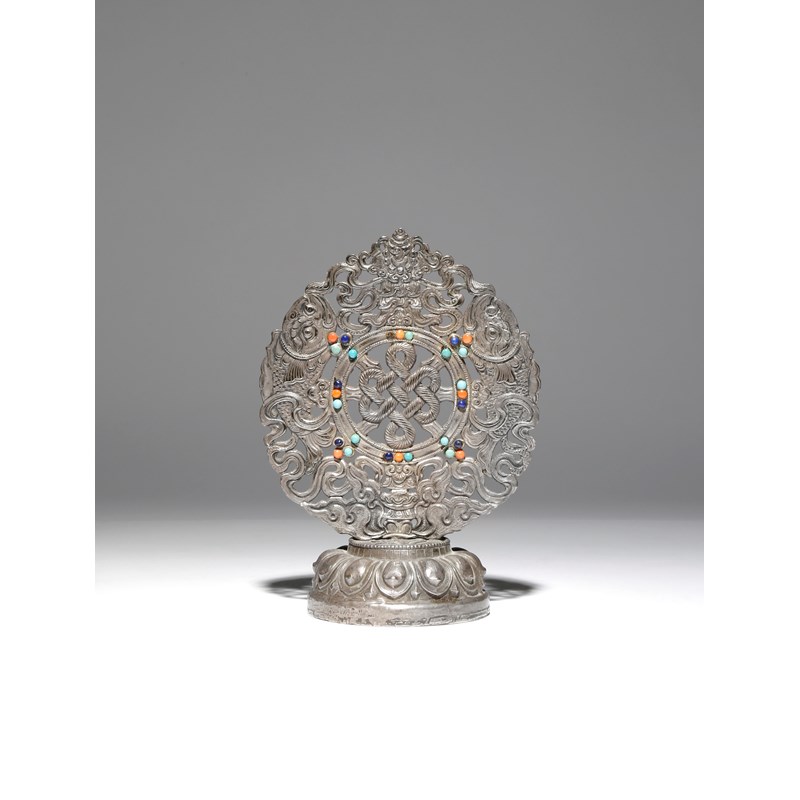 A TIBETAN SILVER BUDDHIST OFFERING 19TH CENTURY Decorated with five Buddhist emblems