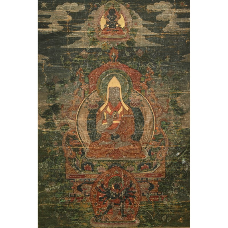 A TIBETAN THANGKA AND A CHINESE KESI 'DRAGON' PANEL 19TH CENTURY The thangka depicting a Lama...