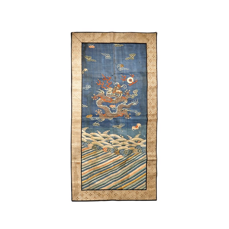 The thangka depicting a Lama seated in dhyanasana with one hand in vitarka mudra, with lança characters to the reverse, the rectangular silk panel embroidered with a dragon chasing a flaming pearl above crashing waves, the beast surrounded by two bats in flight, all contained within a floral border, 38.5cm x 26.4cm and 81.2cm x 36.2cm. (2)