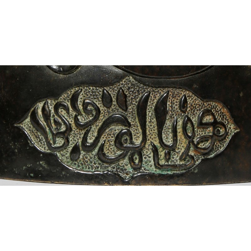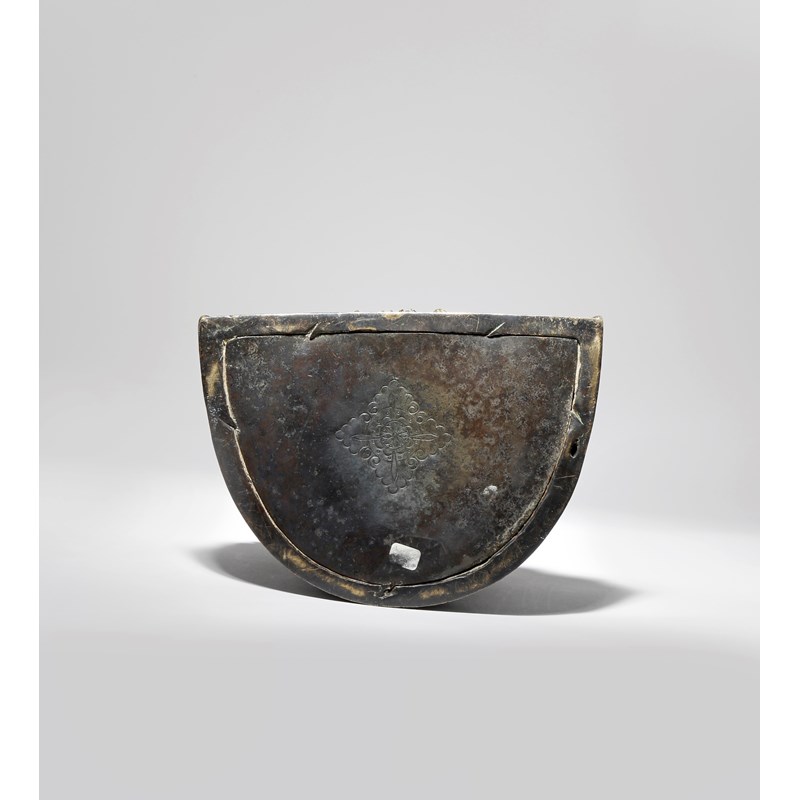 Cast seated in dhyanasana upon flowing fabric, he holds one hand in vitarka mudra and the other in dhyana mudra, with a leafy branch growing to one side, his facial features well-defined and set beneath arched eyebrows, all raised on a semicircular pedestal decorated with a floral spray to the front and an inscription enclosed within a cartouche to the reverse, the base incised with a flower surrounded by rings and swirls, 26.4cm, 2.6kg.