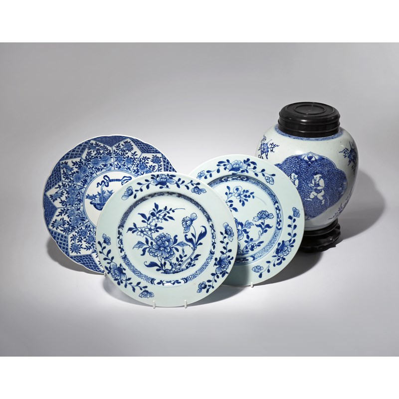 A CHINESE BLUE AND WHITE OVOID VASE AND THREE PLATES 18TH AND 19TH CENTURY The vase painted with...