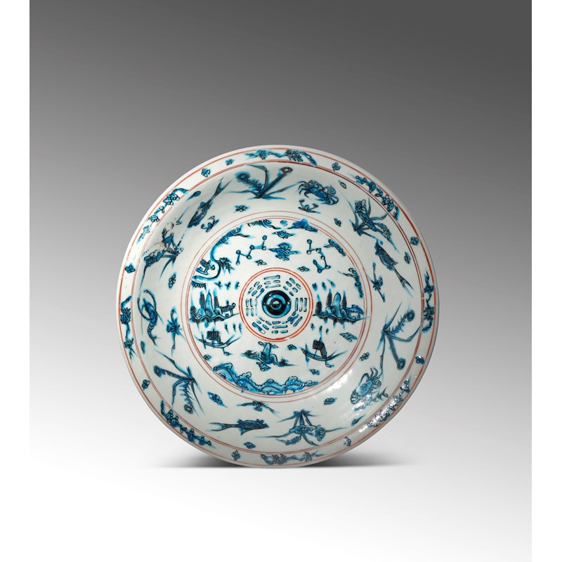 The deep body rising from a tapering foot to an everted rim, painted in turquoise and black enamels with the Eight Trigrams encircling a yin-yang symbol, the central medallion surrounded by a scene of fishing boats sailing by mountains under a starry night sky, with fish, crabs and crustacea amidst aquatic plants to the cavetto, the designs divided by simple iron-red bands, 39.3cm.