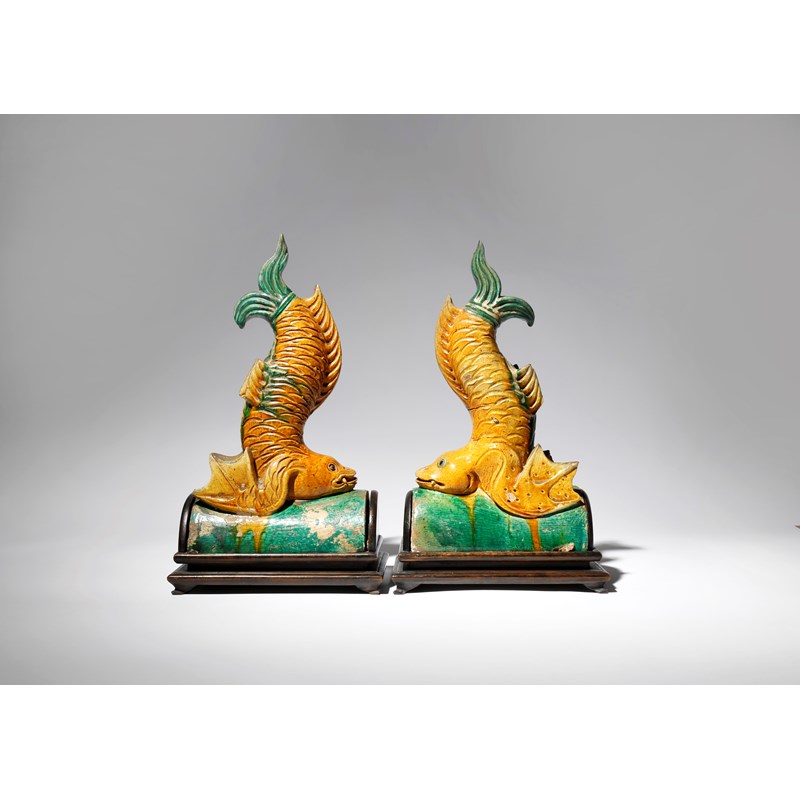 A NEAR PAIR OF CHINESE GREEN AND AMBER GLAZED POTTERY ROOF TILES MING DYNASTY Each modelled as a...