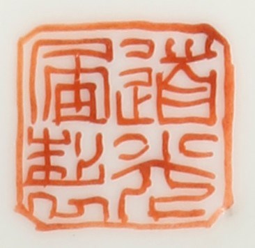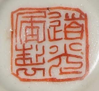 Painted with three figures rowing a boat over rolling waves towards a large steamship, the cover similarly decorated, with four character Daoguang marks in iron-red, 11.2cm. (2)