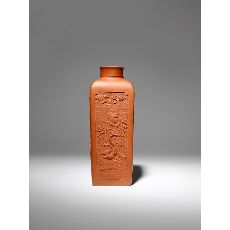 A CHINESE YIXING SQUARE-SECTION TEA CANISTER AND COVER 18TH CENTURY Each facet decorated in...