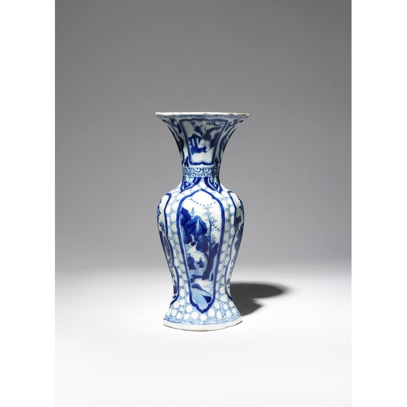 A CHINESE BLUE AND WHITE MOULDED VASE KANGXI 1662-1722 Painted with panels enclosing figures in...