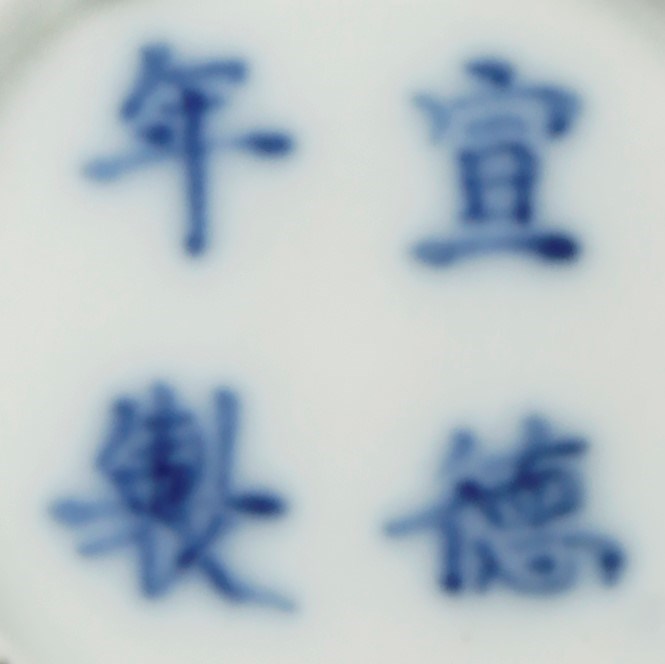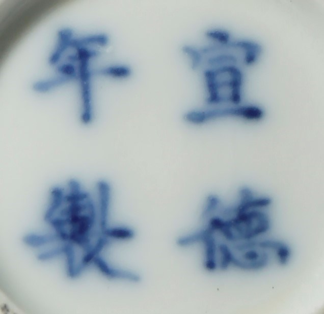 The shallow bodies painted to the exterior with stylised lotus medallions, each with a recessed base and a four character Xuande mark in underglaze blue, 7cm. (2)