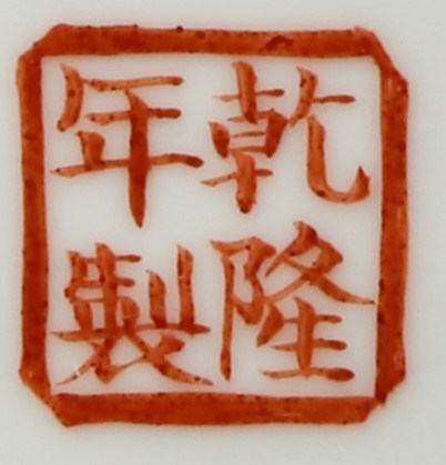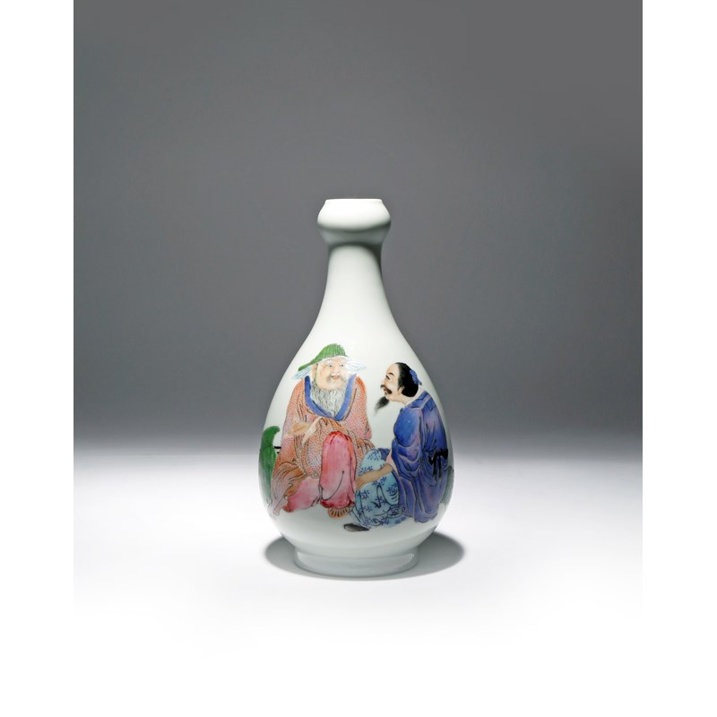 The pear-shaped body painted with two conversing seated fishermen, with a basket, hat and fishing rods at their sides, the base with a four character Qianlong mark, 23.2cm.
