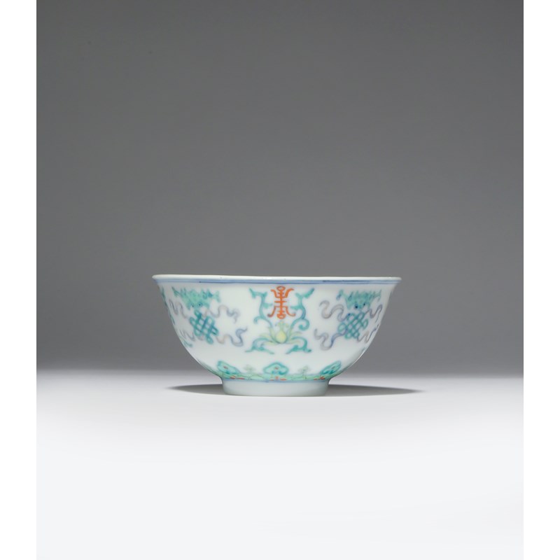A CHINESE DOUCAI 'BUDDHIST EMBLEMS' BOWL 20TH CENTURY The U-shaped body raised on a tapering foot...