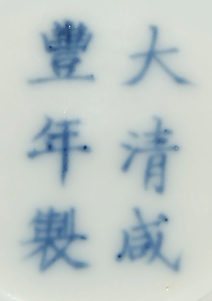 The U-shaped body raised on a tapering foot and with an everted rim, painted with alternating beribboned endless knots and lotus sprays beneath shou characters, with a six character Xianfeng mark to the base, 10.6cm.