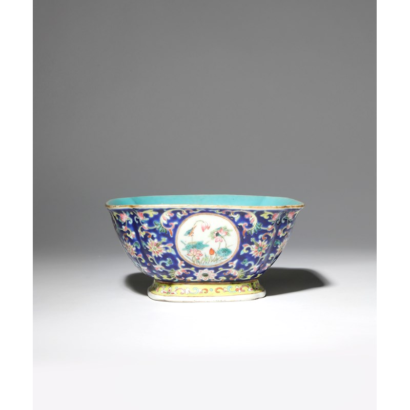 A CHINESE FAMILLE ROSE BLUE-GROUND QUATRELOBED BOWL 19TH CENTURY Painted with four roundels...