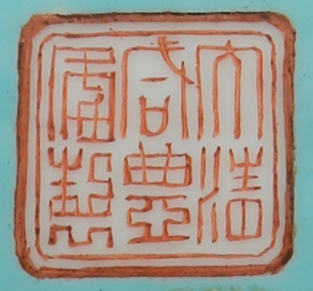 Painted with four roundels enclosing prunus, peony, chrysanthemum and lotus, all reserved on a deep blue ground decorated with scrolling flowers, the interior and base glazed turquoise, with a six character Xianfeng mark to the base, 19cm.