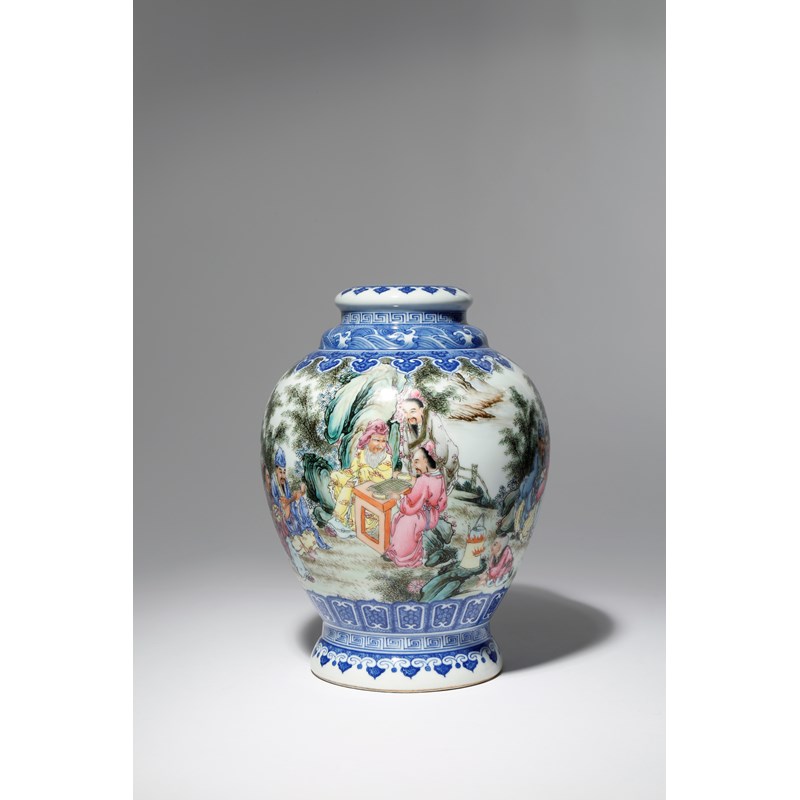 A CHINESE FAMILLE ROSE OVOID VASE 20TH CENTURY Painted with figures playing instruments