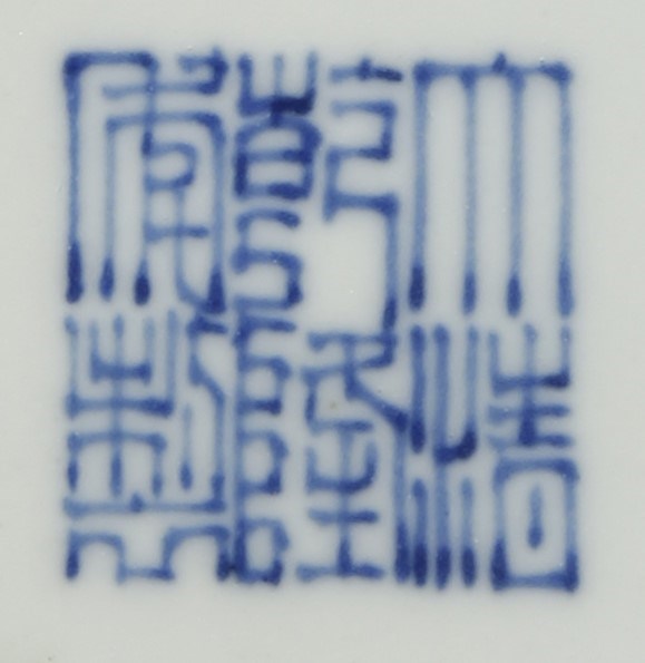 Painted with figures playing instruments, go and reading in a landscape, the reverse with calligraphy, all between bands of ruyi-heads and lappets in underglaze blue, with a six character Qianlong mark to the base, 21.4cm.