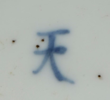 The exterior painted in underglaze blue with flowerheads amidst stylised scrolling leaves, the design contained between bands of lappets enclosing foliate motifs, with a mark reading Tian to the base, 10.5cm.