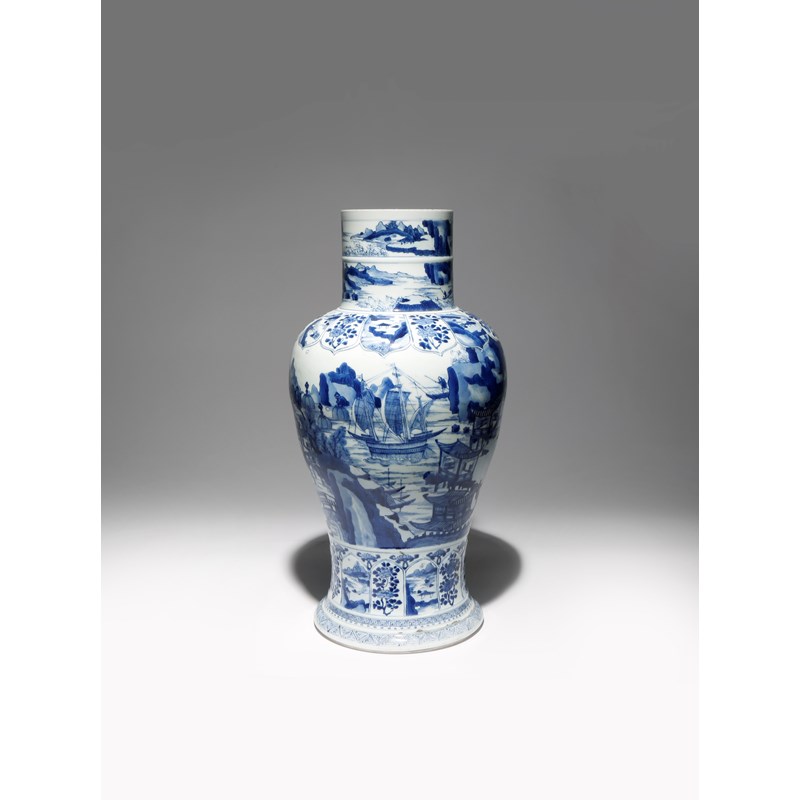 A CHINESE BLUE AND WHITE 'SAN TANG YIN YUE' MOULDED BALUSTER VASE KANGXI 1662-1722 Painted with a...