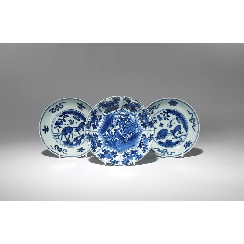A PAIR OF CHINESE BLUE AND WHITE SAUCERS AND A KRAAK PORCELAIN SAUCER LATE MING DYNASTY Each of...