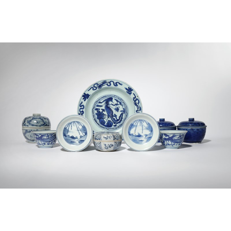 Provenance: from a deceased estate, Dorset. The pair of saucers and 'phoenix' bowls formerly from the Hatcher Collection, and then purchased from C P Sheffield on 24th March 1984. The dish and larger blue and white bowl and cover purchased from Christie's London on 6th July 1984, lot 385 (part lot). The smaller blue and white circular box and cover purchased from Artemesia, Alresford on 10th September 1987. Copies of the invoices are available.