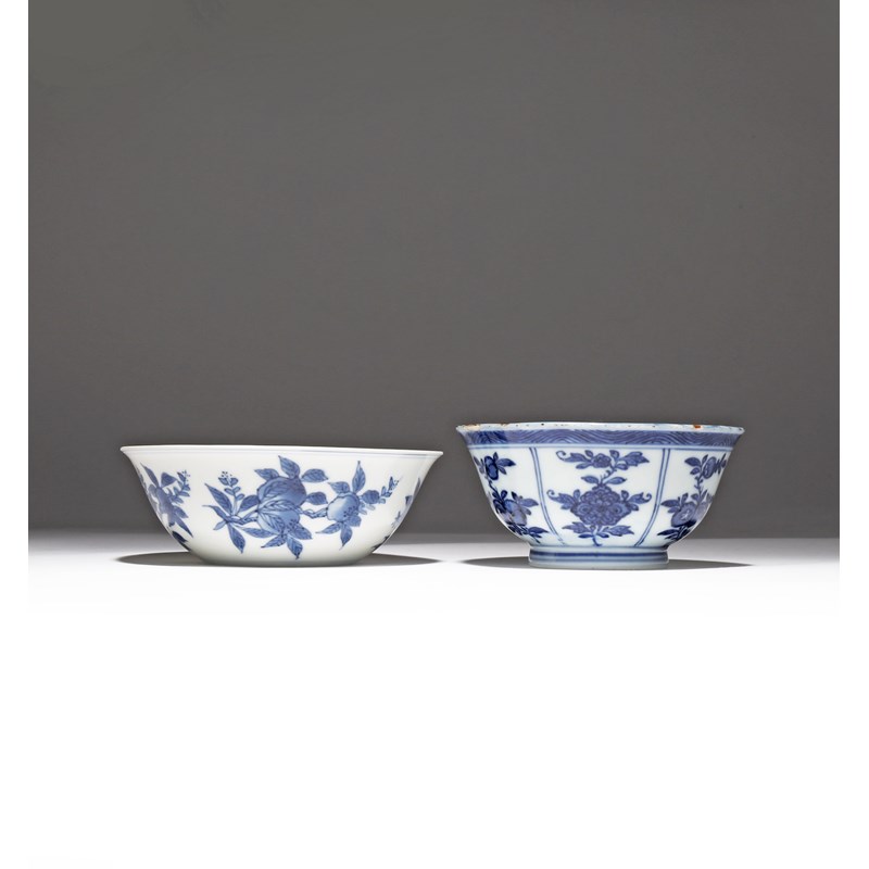 TWO SMALL CHINESE BLUE AND WHITE BOWLS 18TH CENTURY One painted with branches of fruiting peaches...