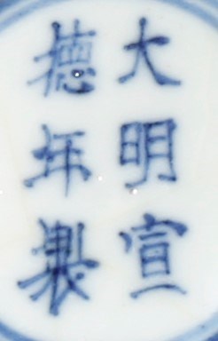 One painted with branches of fruiting peaches and pomegranates, the centre with four floral sprays, with a six character Wanli mark to the base, the other painted with panels containing flowers and the sanduo, the base with a six character Xuande mark, 10.9cm and 9.5cm. (2)
