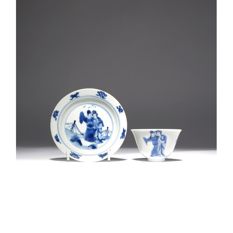 A CHINESE BLUE AND WHITE TEA BOWL AND SAUCER KANGXI 1662-1722 The cup painted with a couple and a...