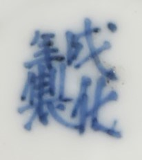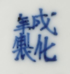 The cup painted with a couple and a lady standing amidst rockwork, the saucer similarly decorated with the lovers standing in a garden beneath a constellation, with beribboned precious objects to the saucer's rim and the rim interior of the cup, each with a four character Chenghua mark to the base, 10.5cm. (2)