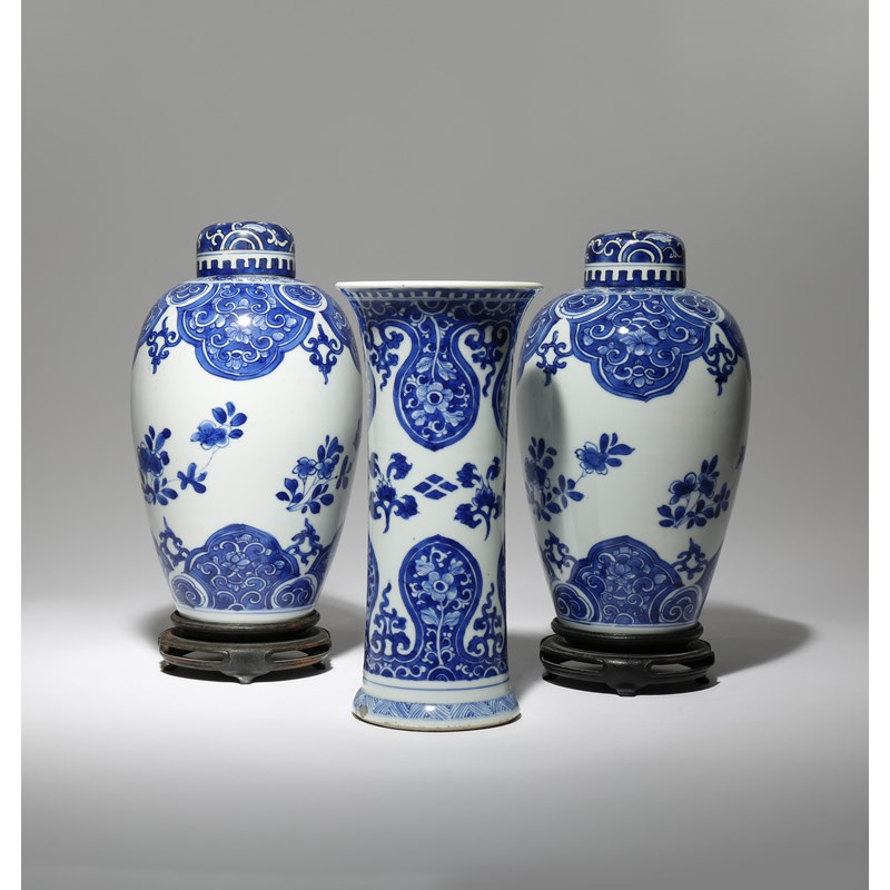 A PAIR OF CHINESE BLUE AND WHITE OVOID VASES AND A BEAKER VASE KANGXI 1662-1722 Decorated with...
