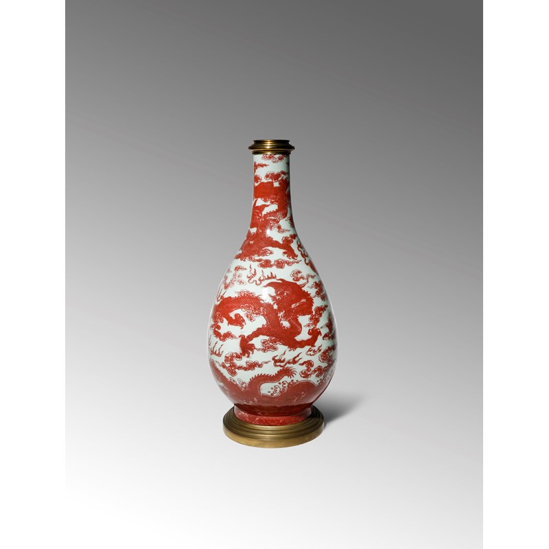The pear-shaped body with a tall tapering neck, decorated with scaly five-clawed dragons amidst clouds and flames, their eyes picked out in underglaze blue, all above breaking waves, the short foot painted with a continuous leaf scroll, with gilt-metal mounts to the neck and foot, the neck reduced and the base lacking, 55cm overall.