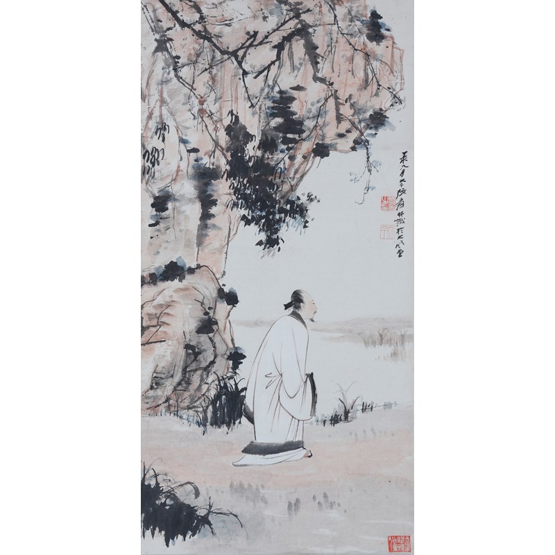 A Chinese scroll painting, ink and colour on paper, inscribed and dated the dinghai year (1947), signed Daqian Zhang Yuan with two artist's seals and one collector's seal, 75cm x 26.5cm.