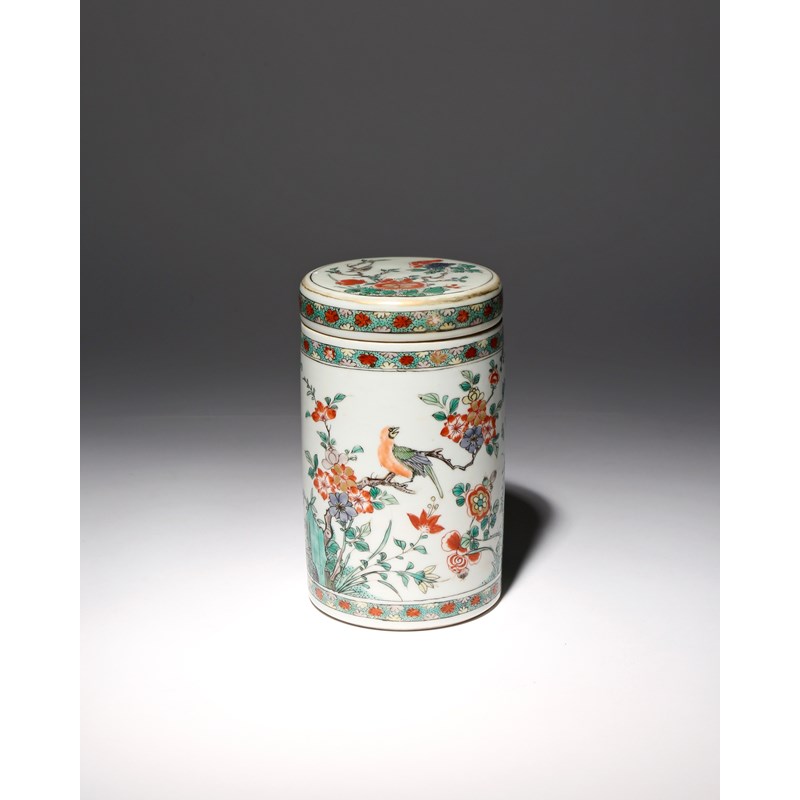 A CHINESE FAMILLE VERTE CYLINDRICAL JAR AND COVER