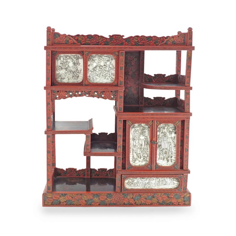 λ A JAPANESE RED LACQUER AND IVORY SHODHANA MEIJI 1868-1912 With asymmetric shelves