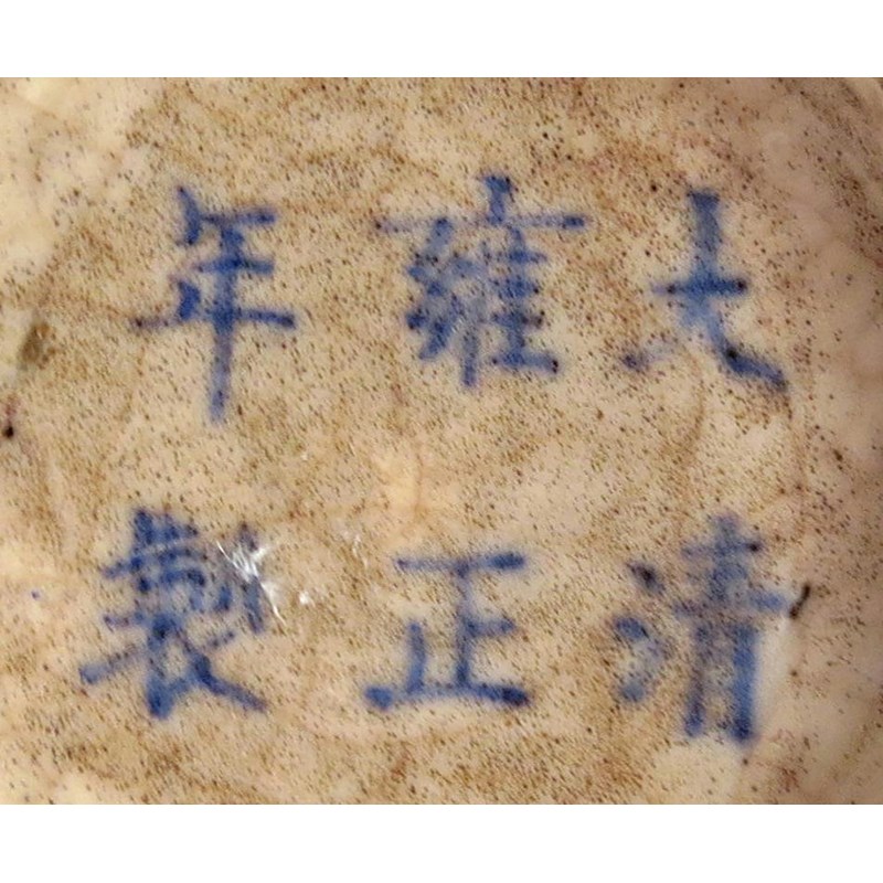 Two in porcelain, two in agate and one in glass, 9cm. (5)